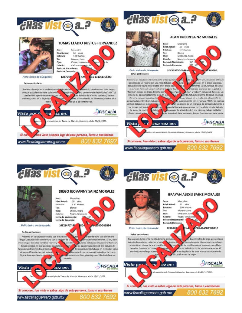 Asimismo, las fichas de búsqueda y localización emitidas por la Fiscalía de Guerrero fueron actualizadas en sus redes sociales, en cuyas tarjetas ya se encuentran a dichas personas con la leyenda de localizados.