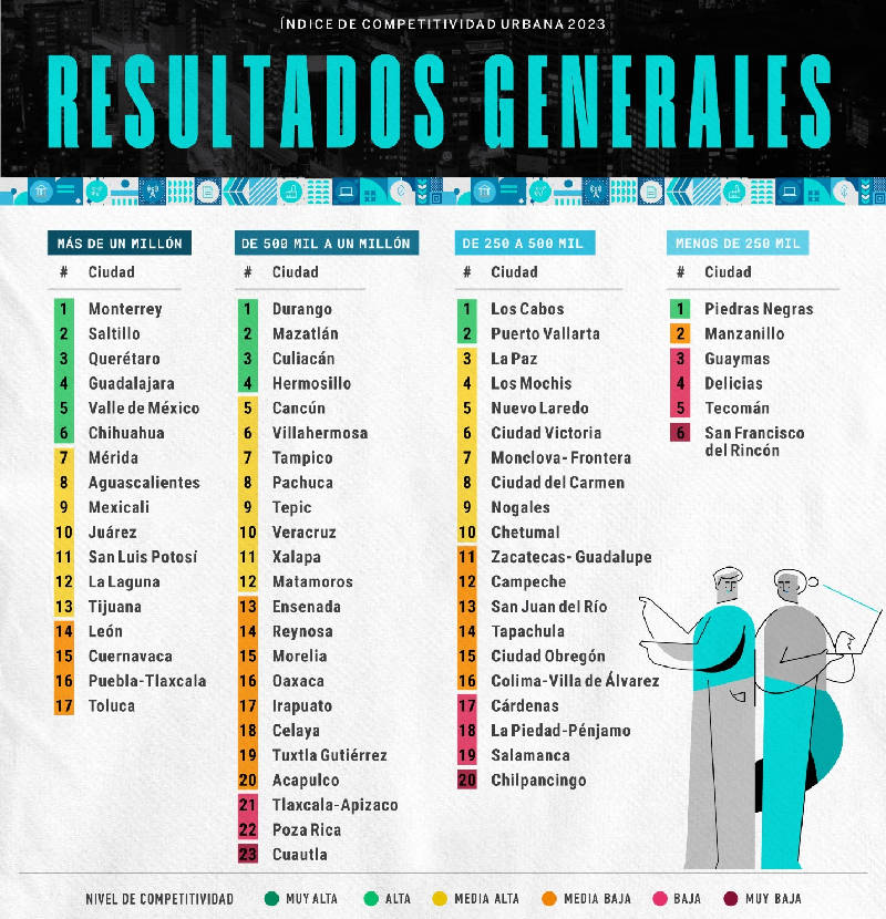 Este análisis forma parte del Índice de Competitividad Urbana 2023, cuyo polo opuesto indica que Monterrey es la ciudad más competitiva entre las ciudades más grandes, seguido por Saltillo, Querétaro y Guadalajara.